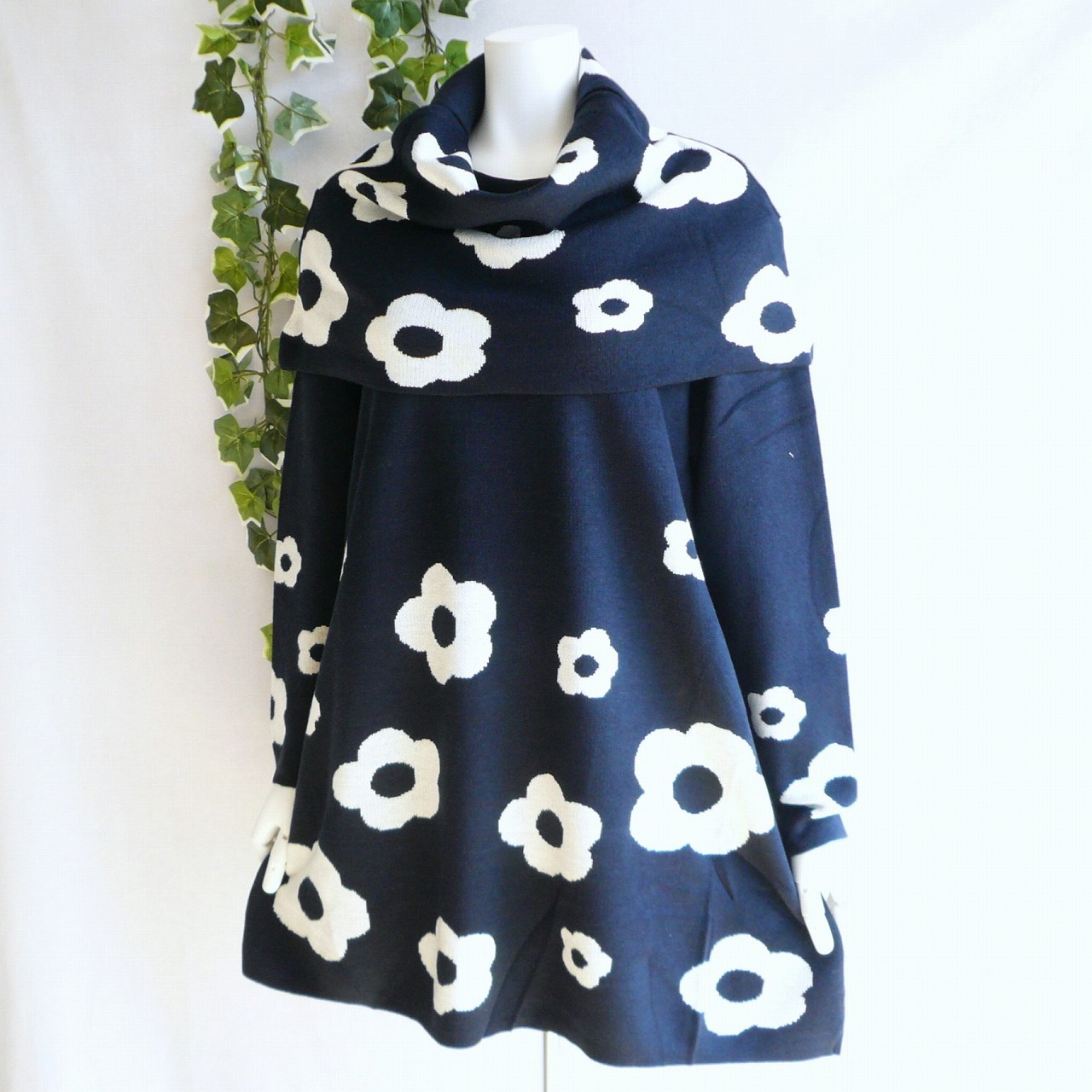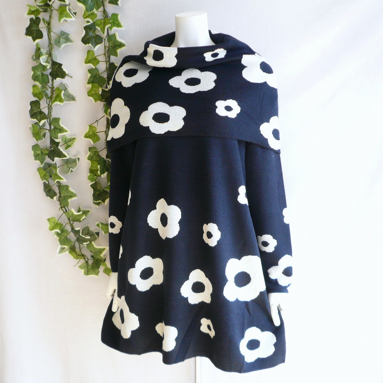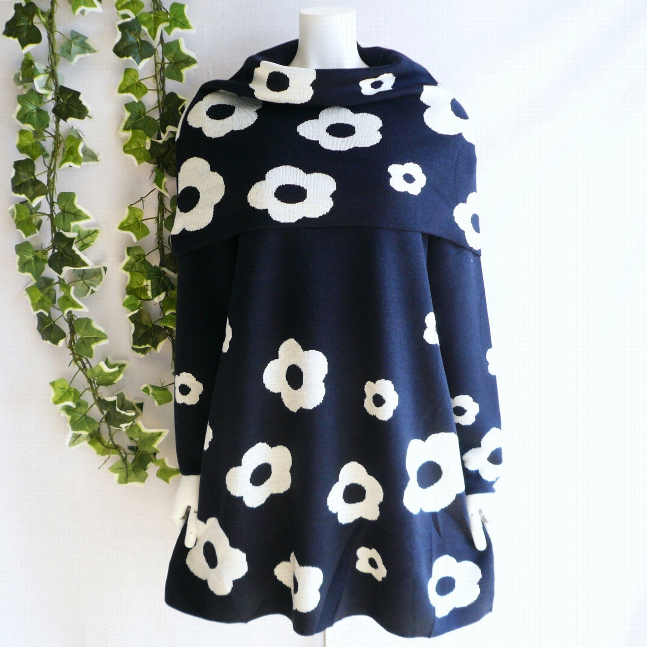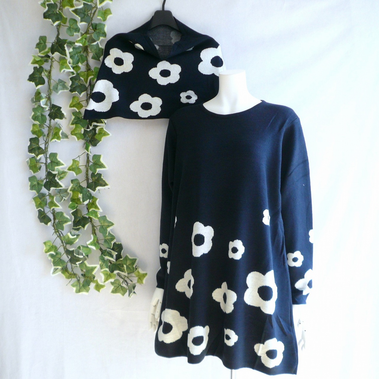 新品 9900 ML 北欧風花柄 ニット チュニック ワンピース 紺系 秋 冬 共ニットスヌード レディース 上品 50代 60代 70代