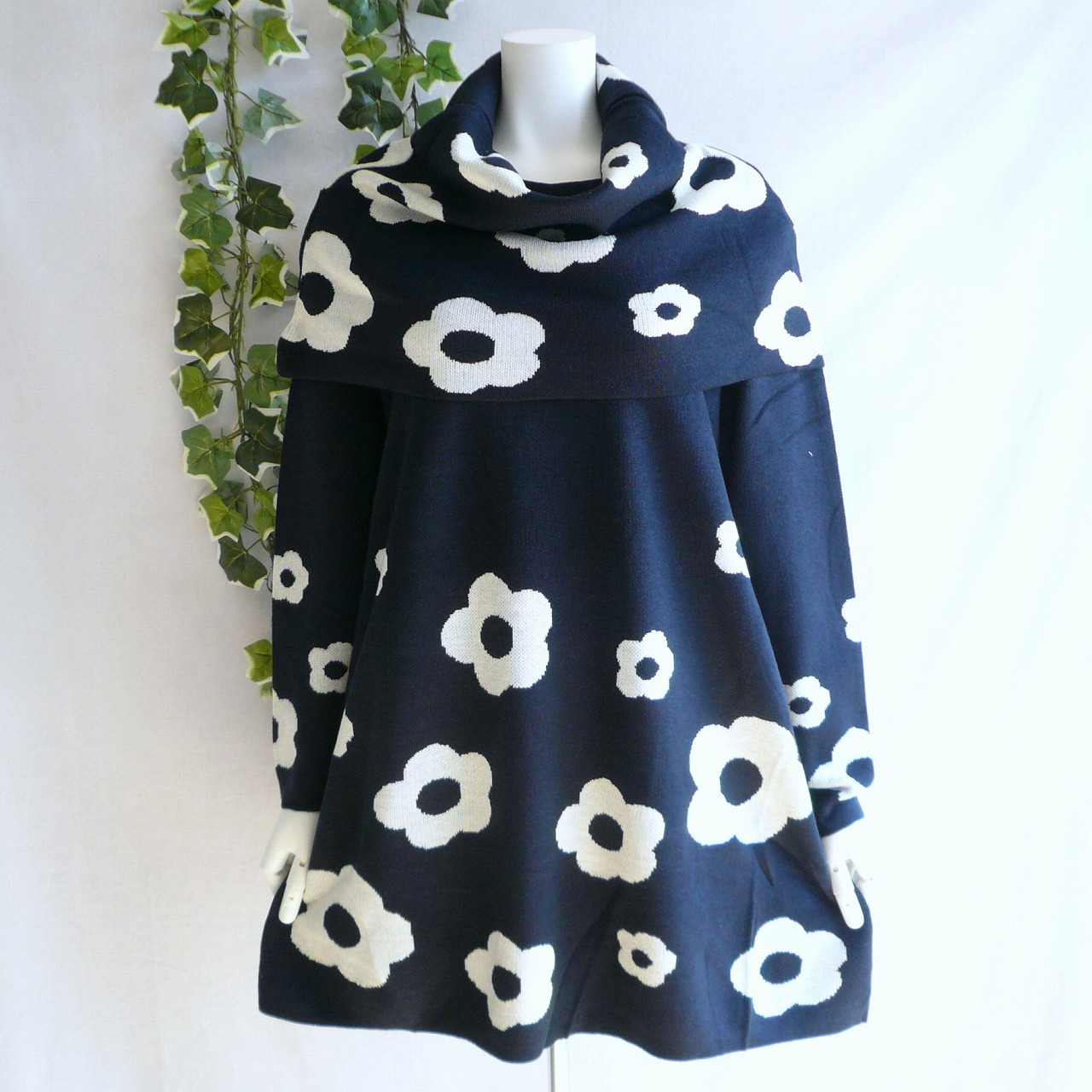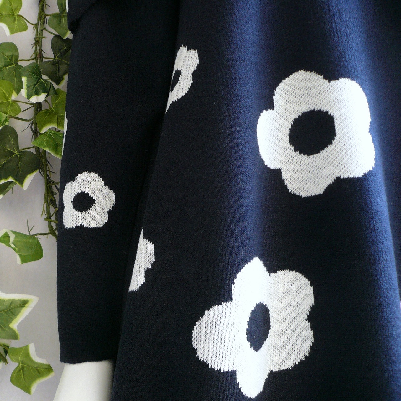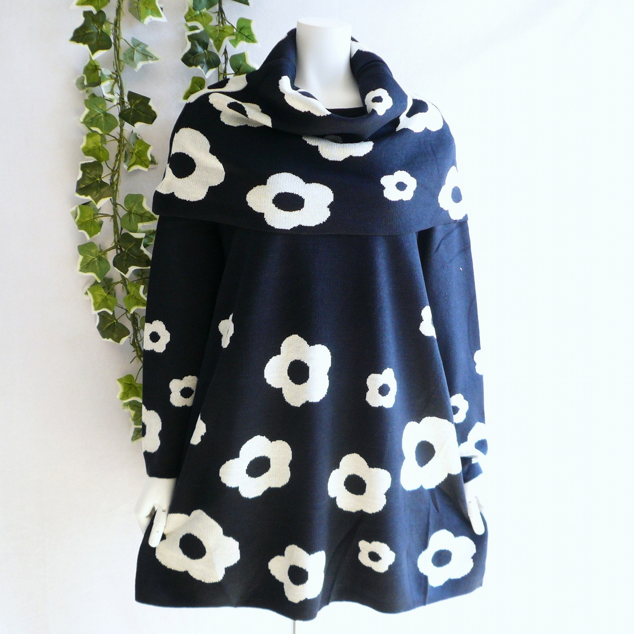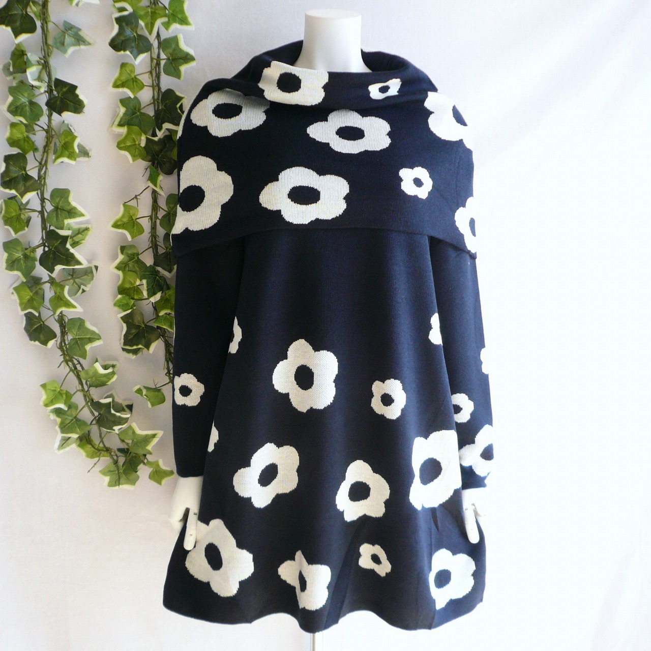 新品 9900 ML 北欧風花柄 ニット チュニック ワンピース 紺系 秋 冬 共ニットスヌード レディース 上品 50代 60代 70代