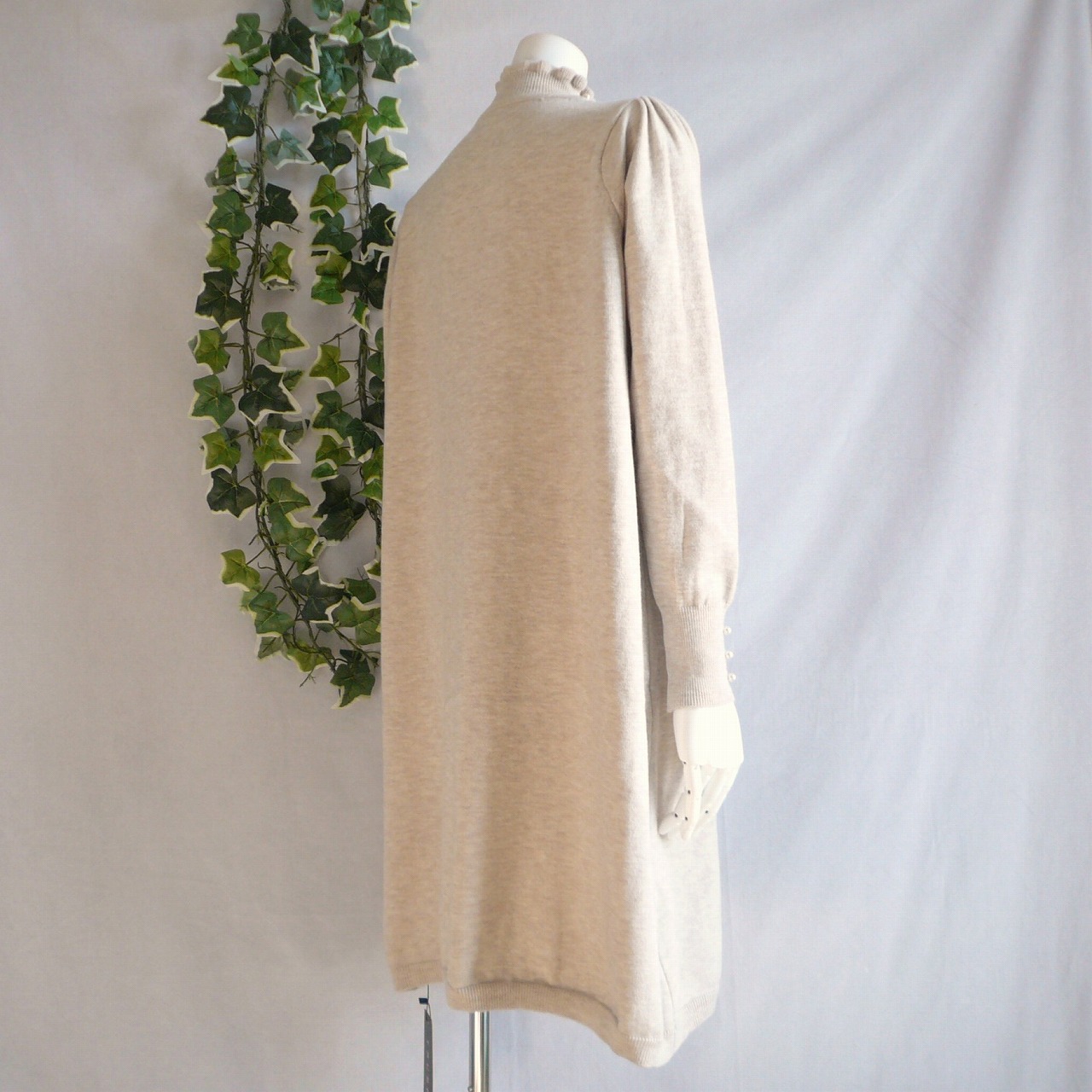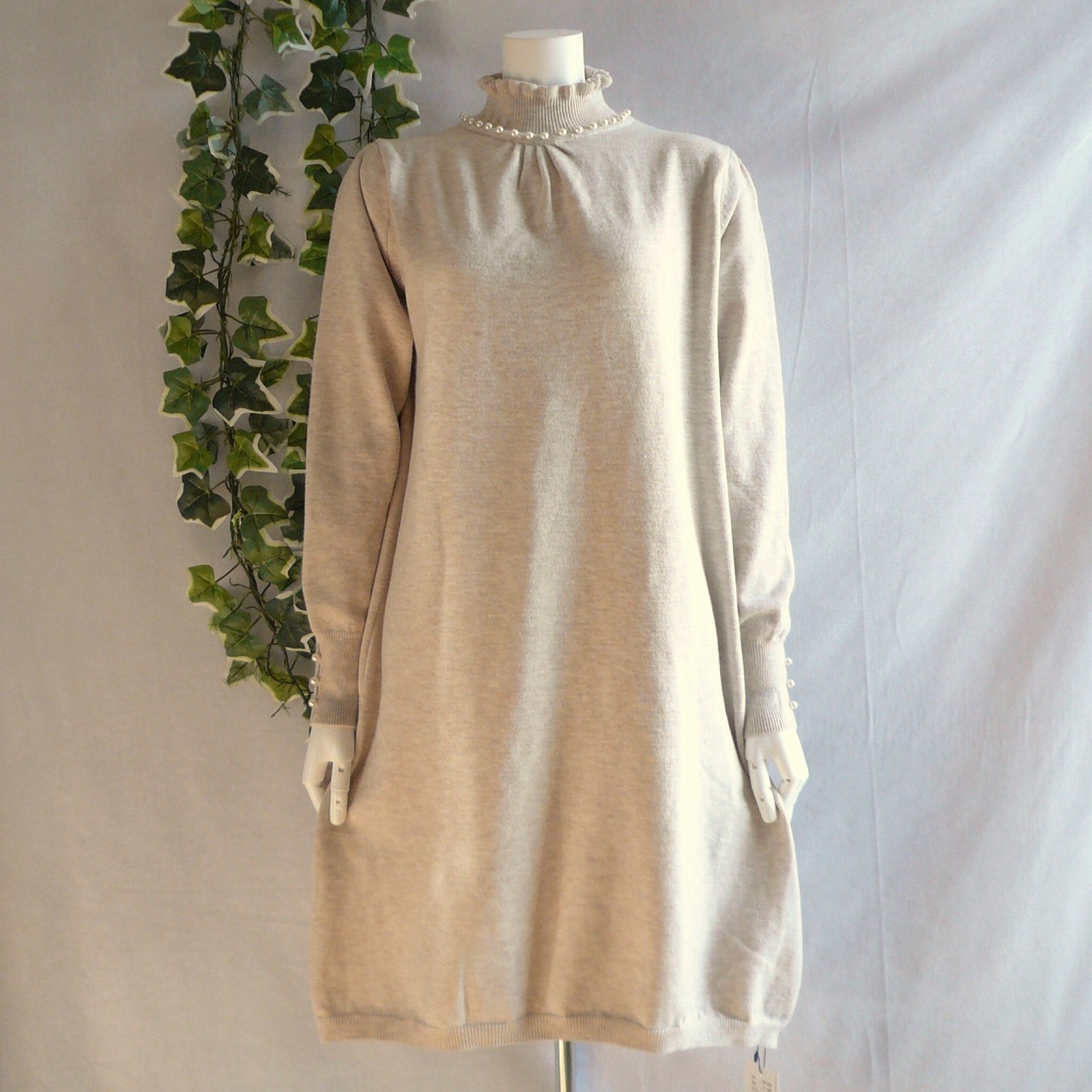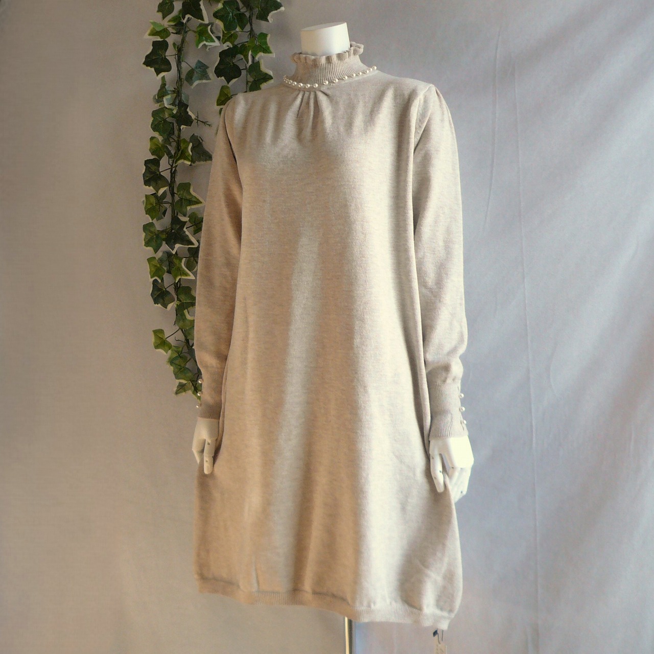 新品 9918 ML パール付き フリル ハイネック ニット チュニック ワンピース ベージュ系 秋 冬 レディース コクーン 上品 50代 60代 70代