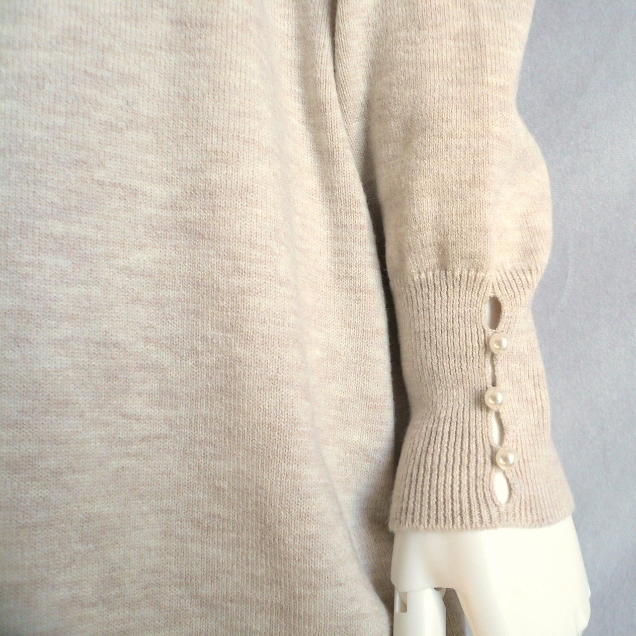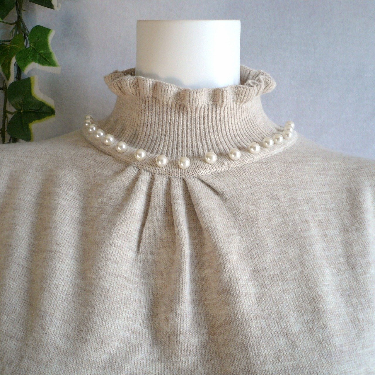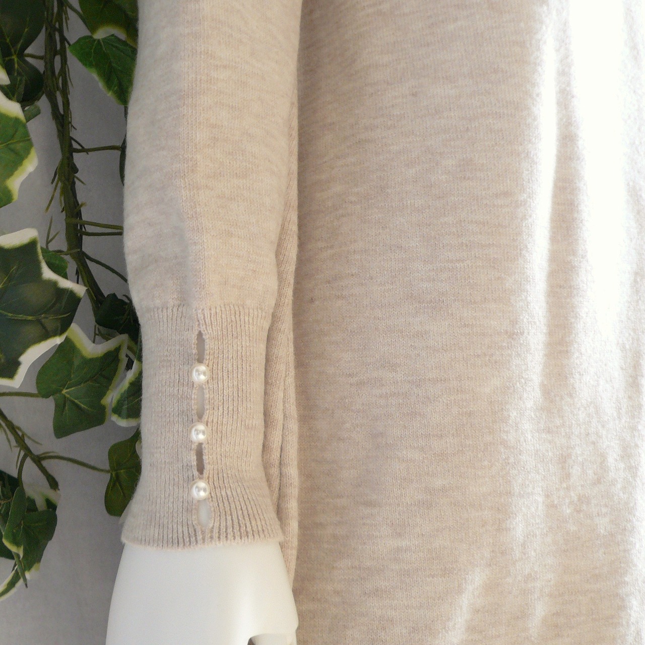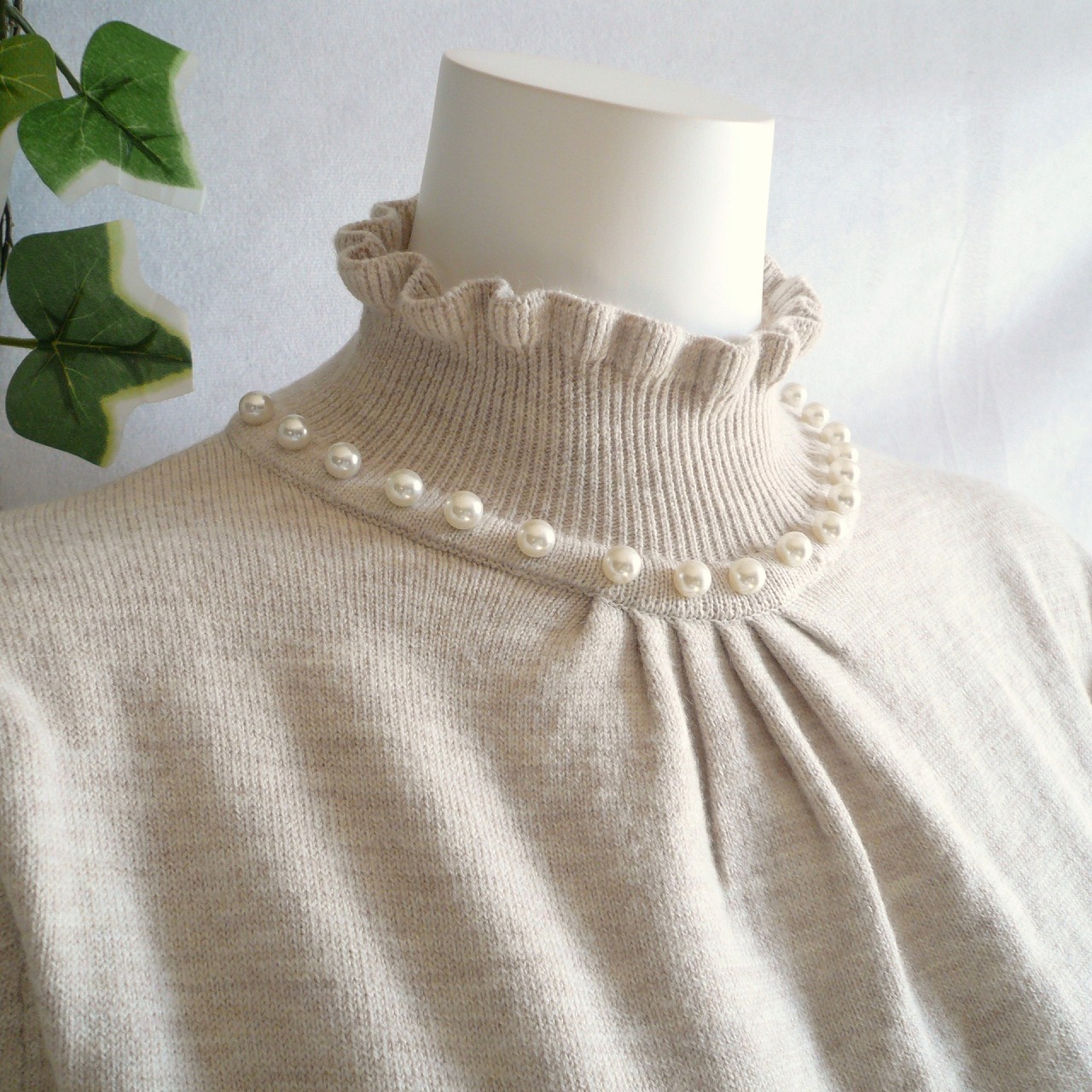 新品 9918 ML パール付き フリル ハイネック ニット チュニック ワンピース ベージュ系 秋 冬 レディース コクーン 上品 50代 60代 70代