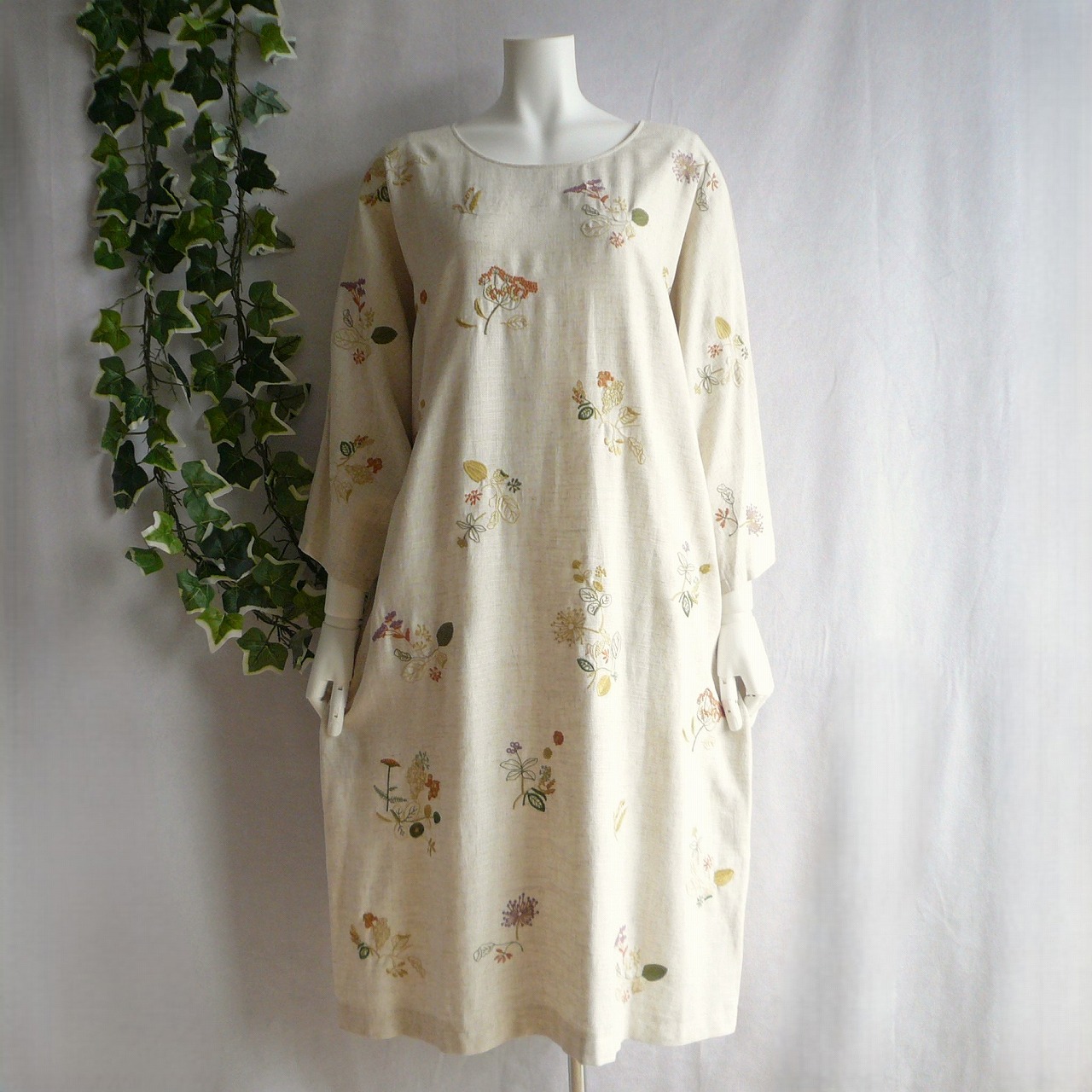 新品 9629 L ボタニカル 刺繍 麻混 ワンピース 生成り 春 夏 秋 レディース コクーン リネン 高級 上質 上品 50代 60代 70代