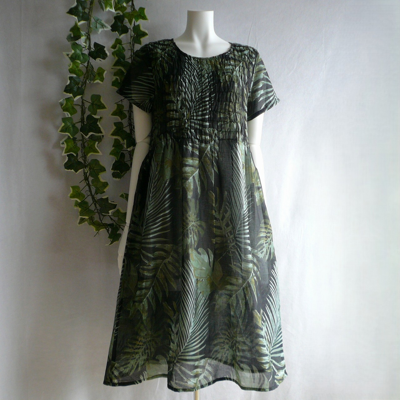 新品 9636 ML 綿100% シャーリング ワンピース 春 夏 モスグリーン系 レディース 大きなリーフ柄 半袖 インド製 コットン 50代 60代 70代