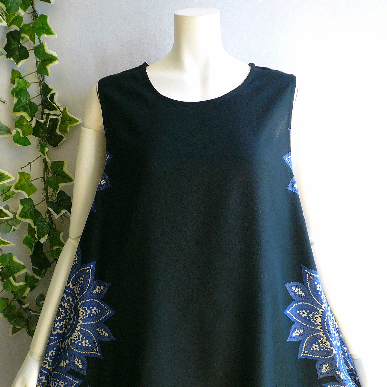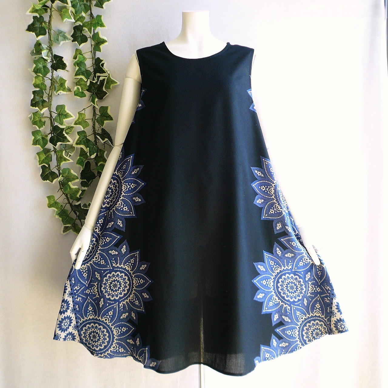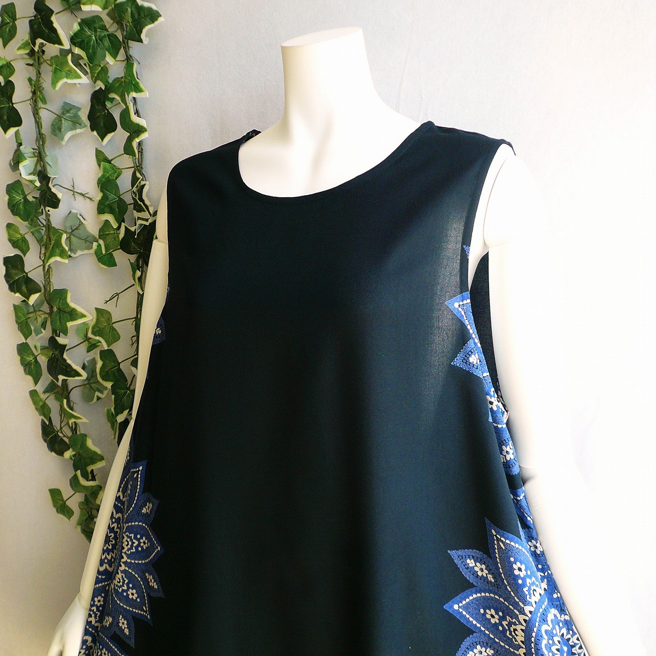 新品 9656 ML サイド花柄 レーヨン100% ワンピース 春 夏 黒 ブルー系 レディース Aラインフレア インド製 50代 60代 70代