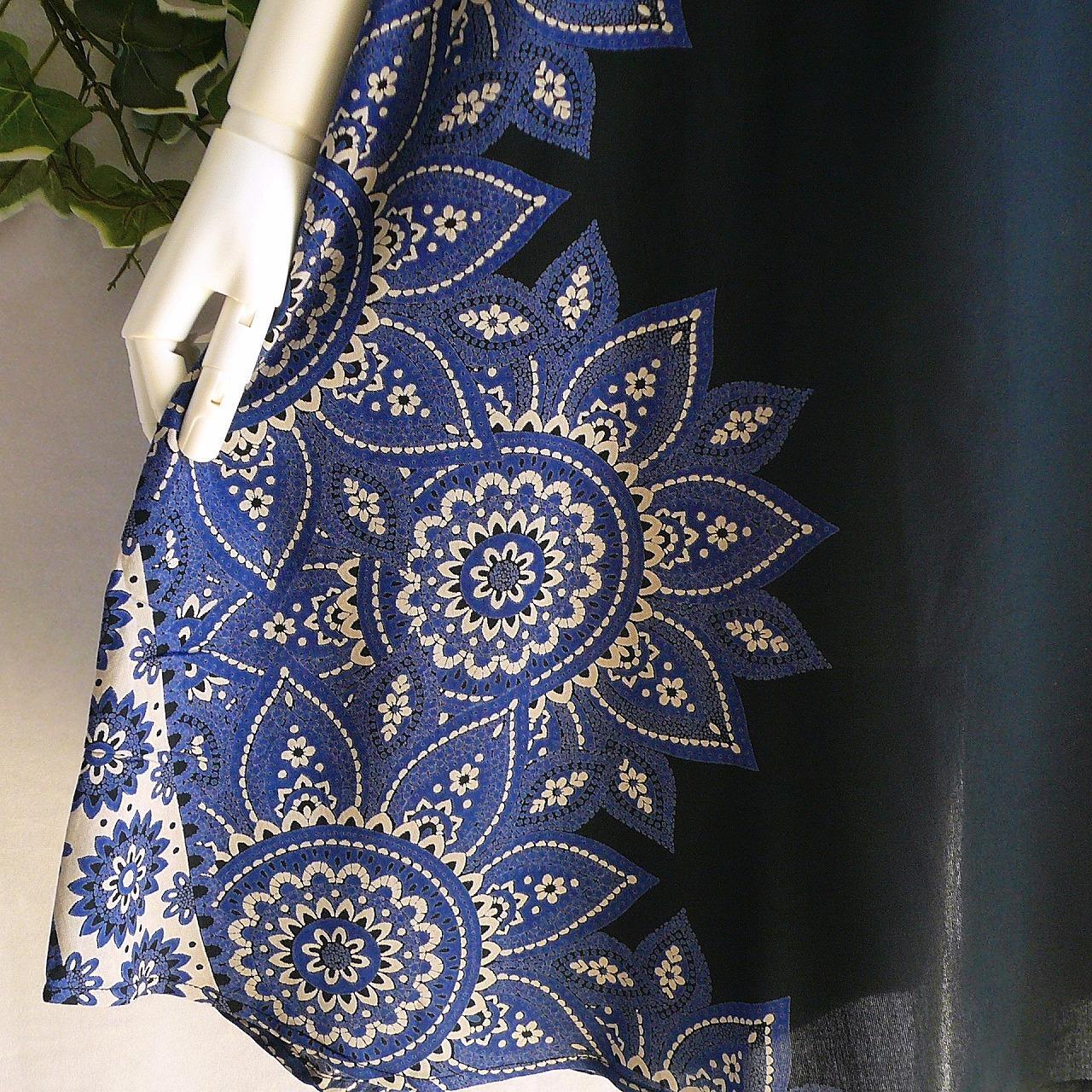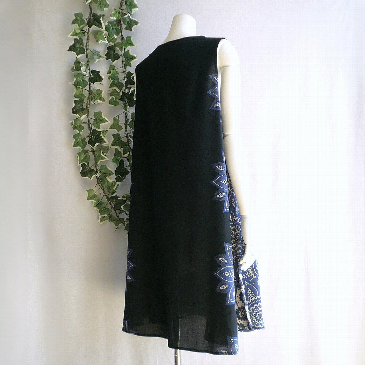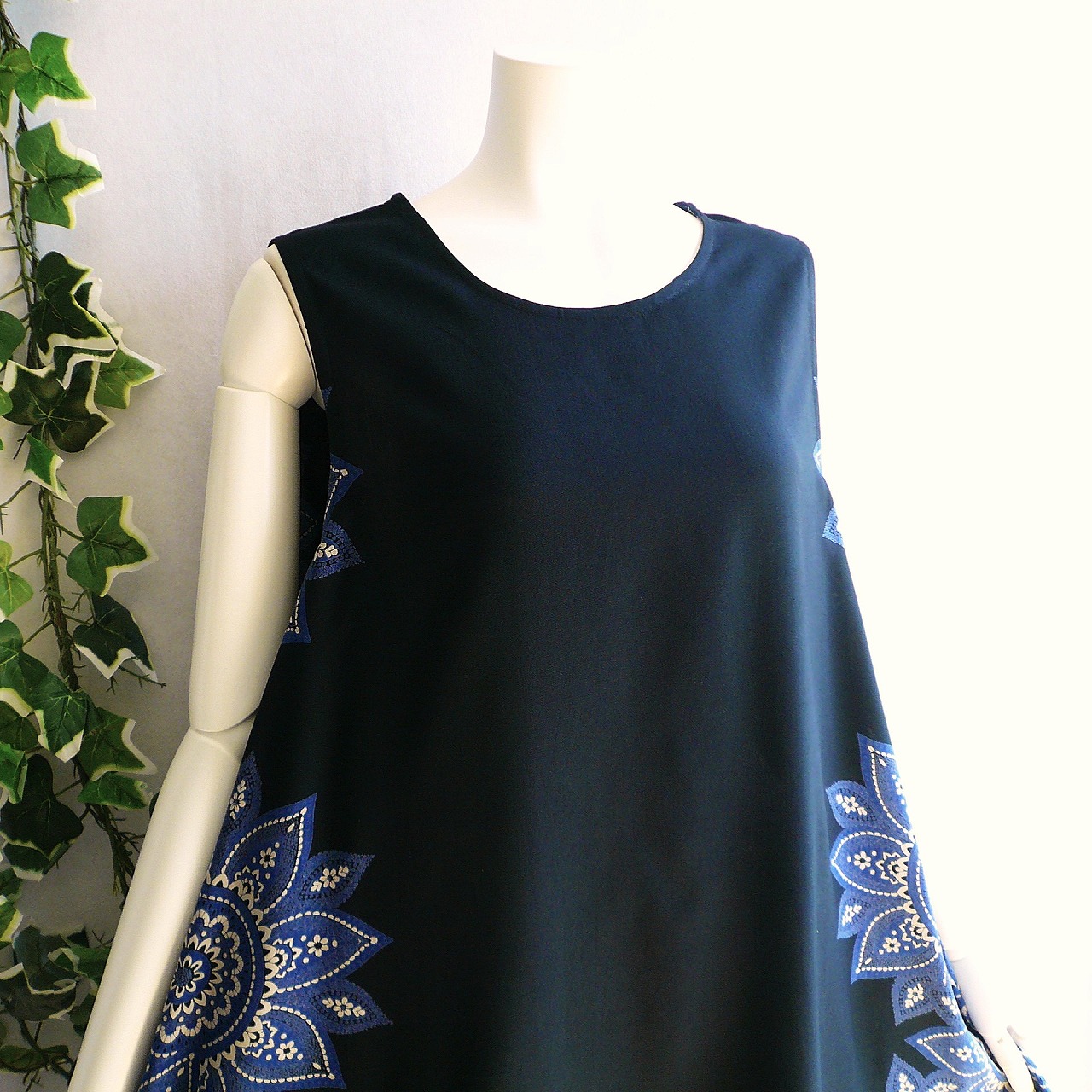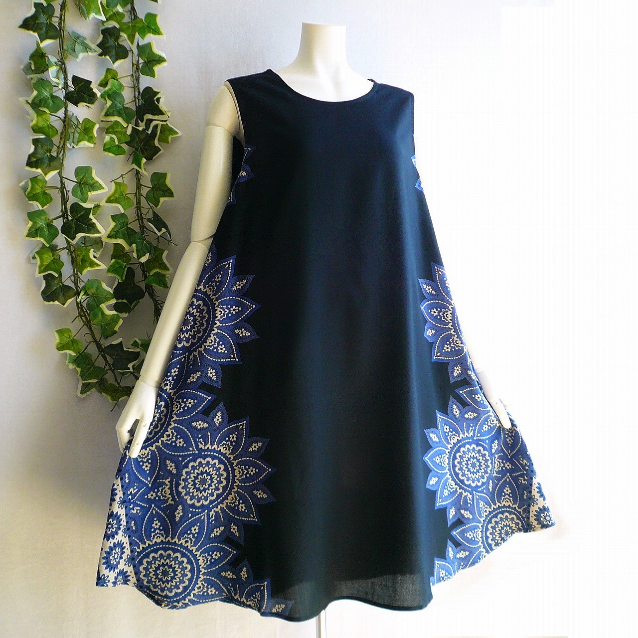 新品 9656 ML サイド花柄 レーヨン100% ワンピース 春 夏 黒 ブルー系 レディース Aラインフレア インド製 50代 60代 70代