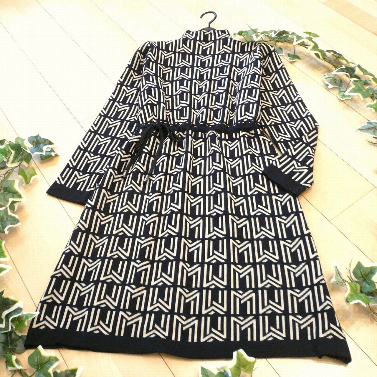 新品 9881 ML ジオメ柄 ニット ワンピース 黒系 ブラック 秋 冬 レディース ボトルネック サイドリボン 上質 上品 50代 60代 70代