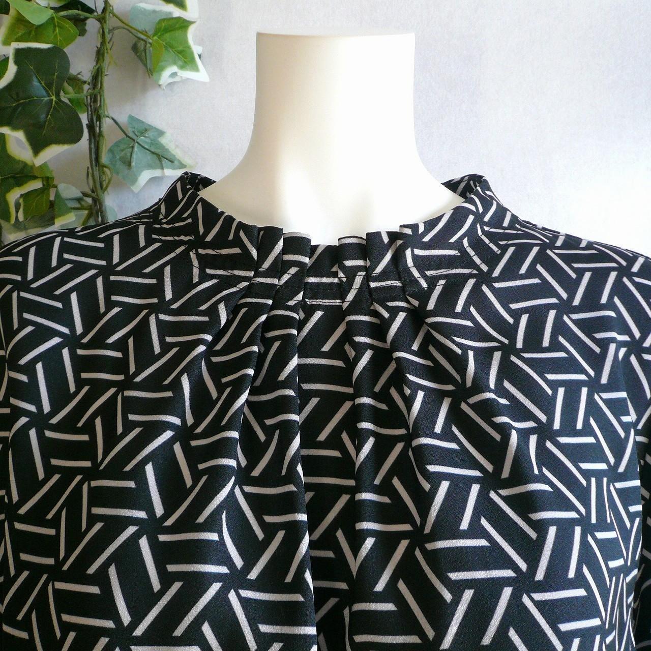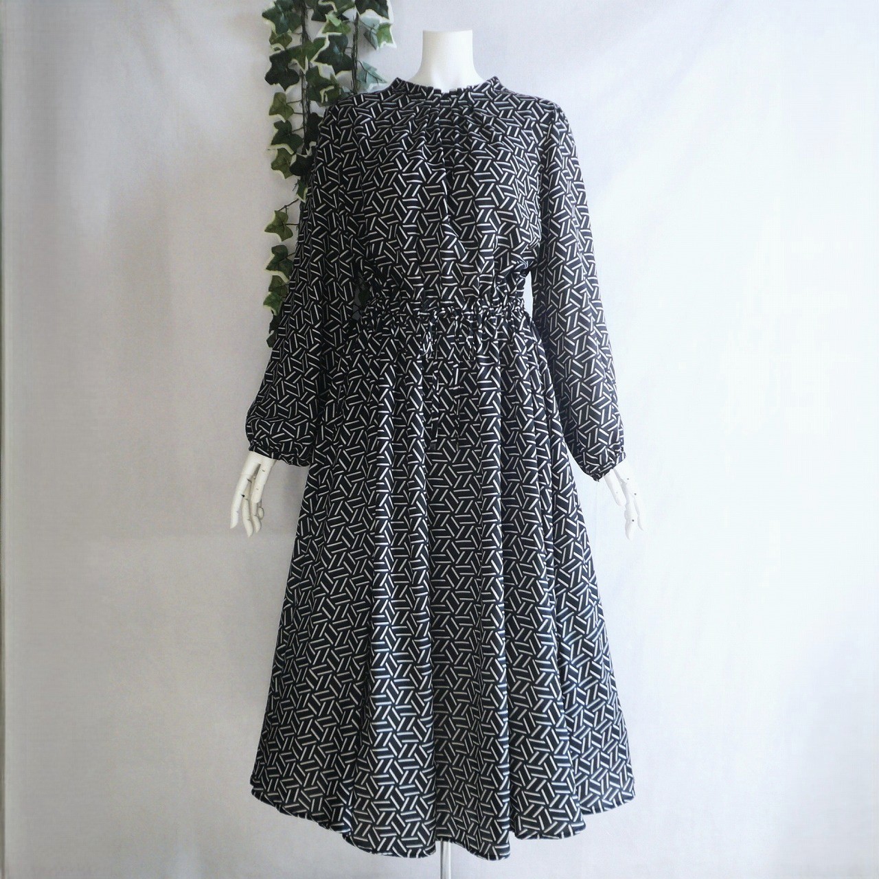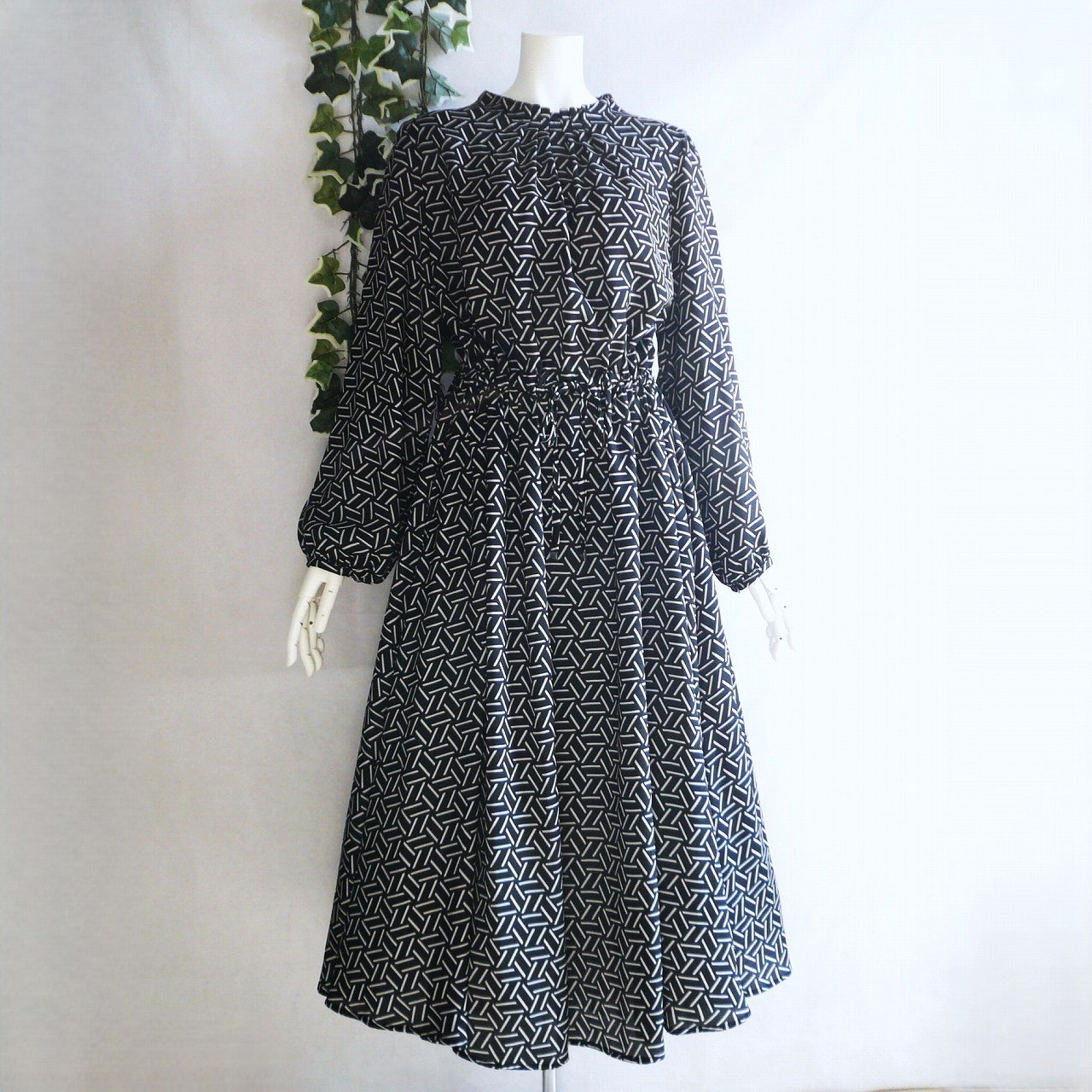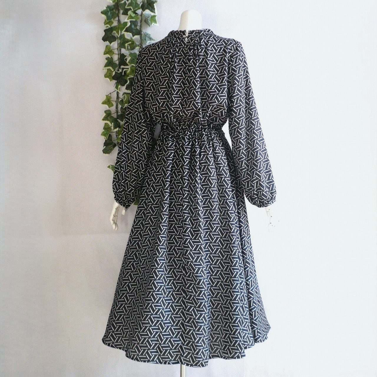 新品 9941 L タック襟 フレア ワンピース 黒系 春 秋 レディース 和風幾何学柄 共布リボン 高級 上質 上品 50代 60代 70代