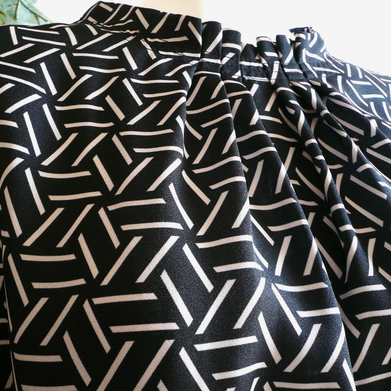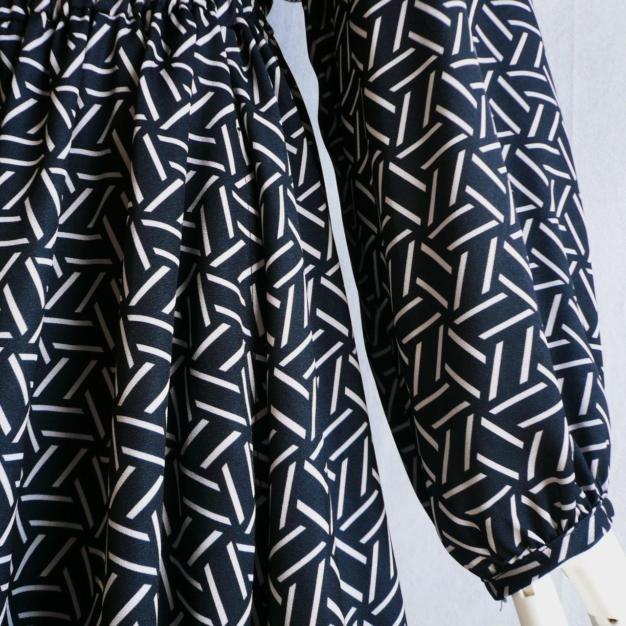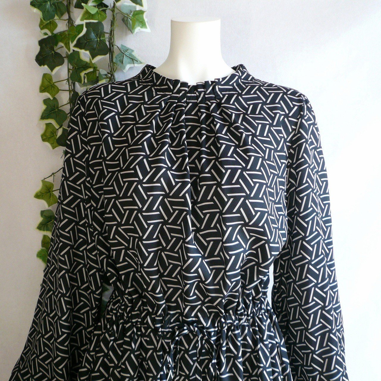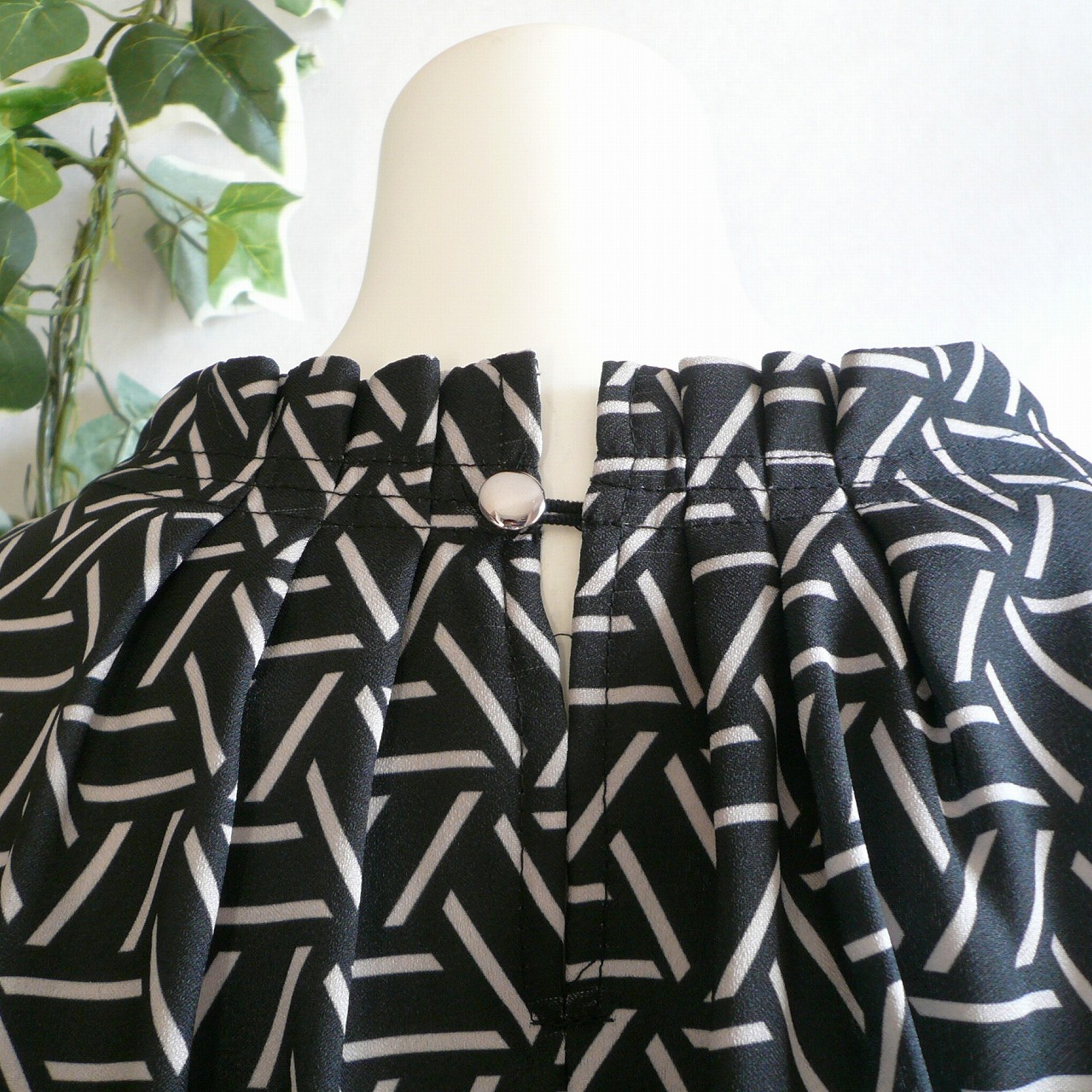 新品 9941 L タック襟 フレア ワンピース 黒系 春 秋 レディース 和風幾何学柄 共布リボン 高級 上質 上品 50代 60代 70代