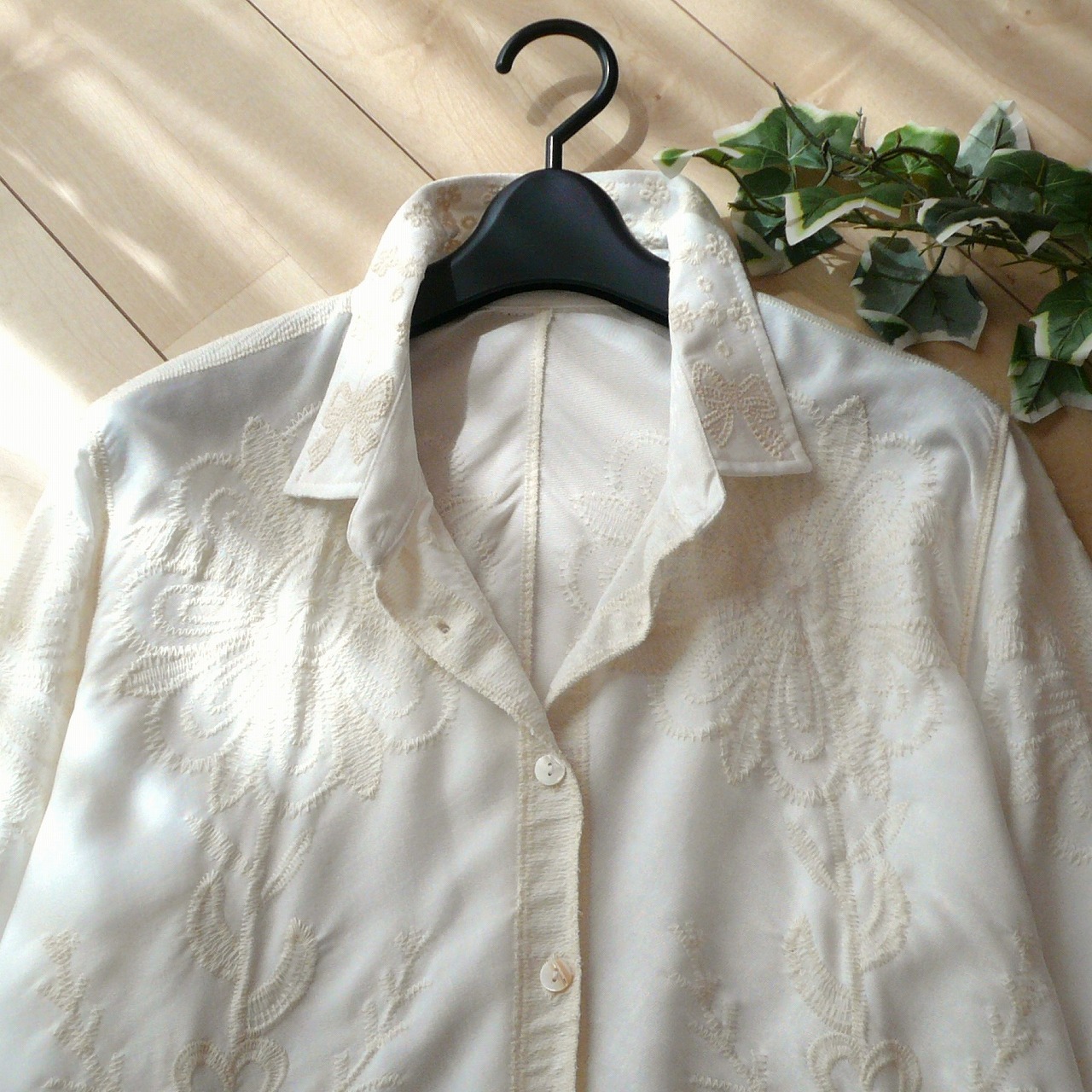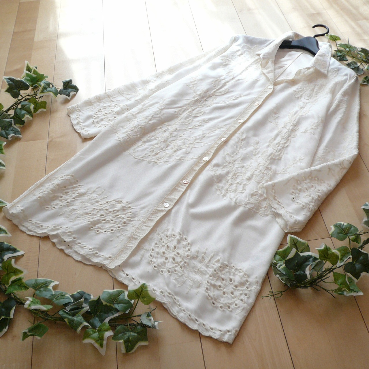 新品 9904 ML 大きな花刺繍 ロングシャツ 白系 秋 レディース 綿混 カットワーク刺繍 シャツ チュニック ワンピース 50代 60代 70代