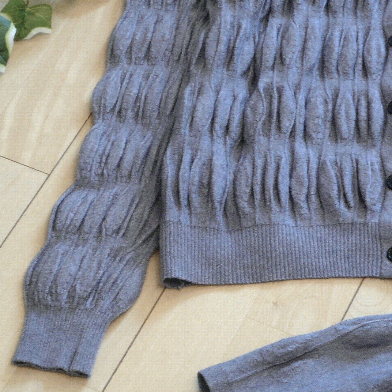 ニットカーディガンは立体プリーツ編みのノーカラースタイルで、上品で高級感のある仕上がり。