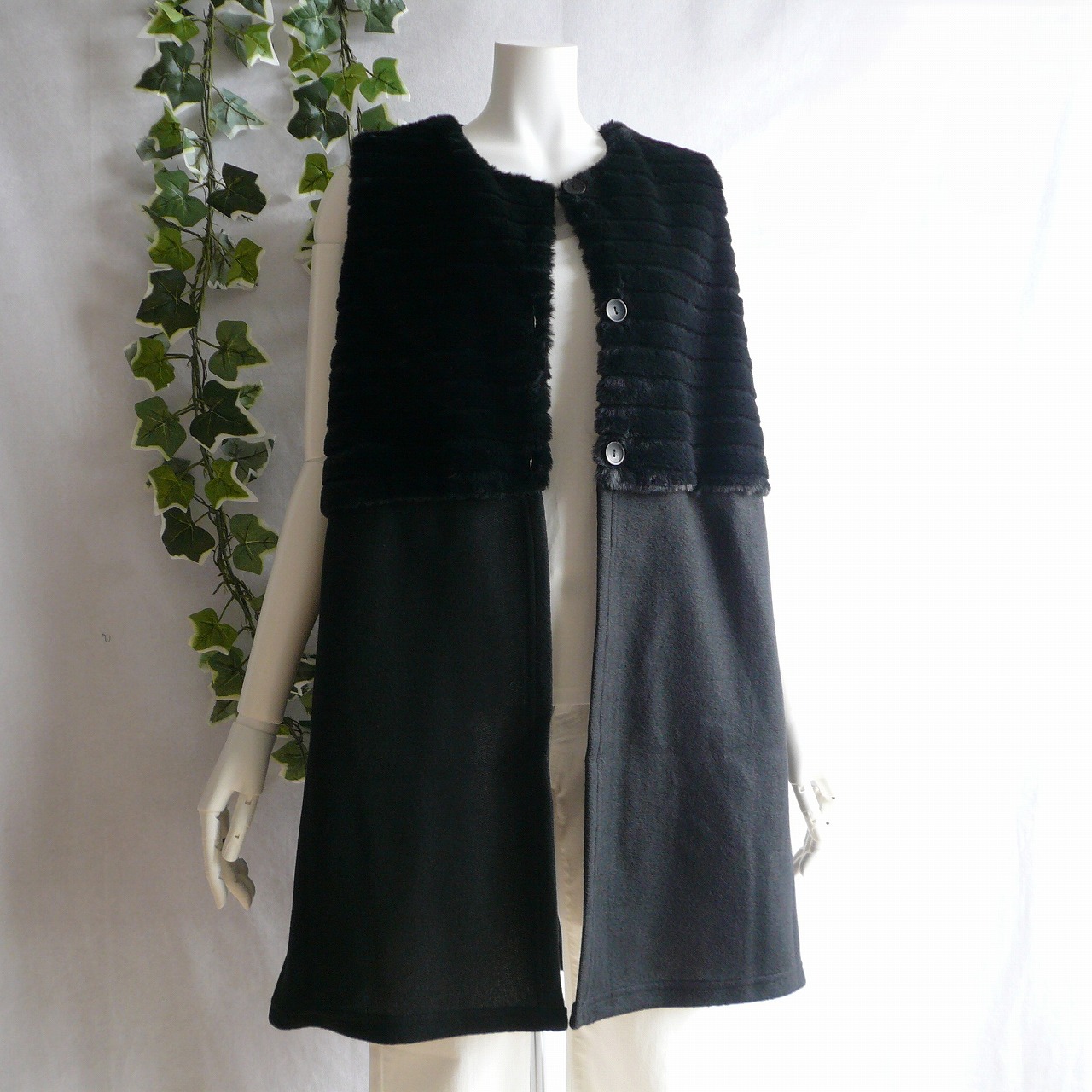 新品 9957 ML ファー 切替 ロング ジレ 黒 秋 冬 レディース フェイクファー 微起毛ニット ベスト 上質 上品