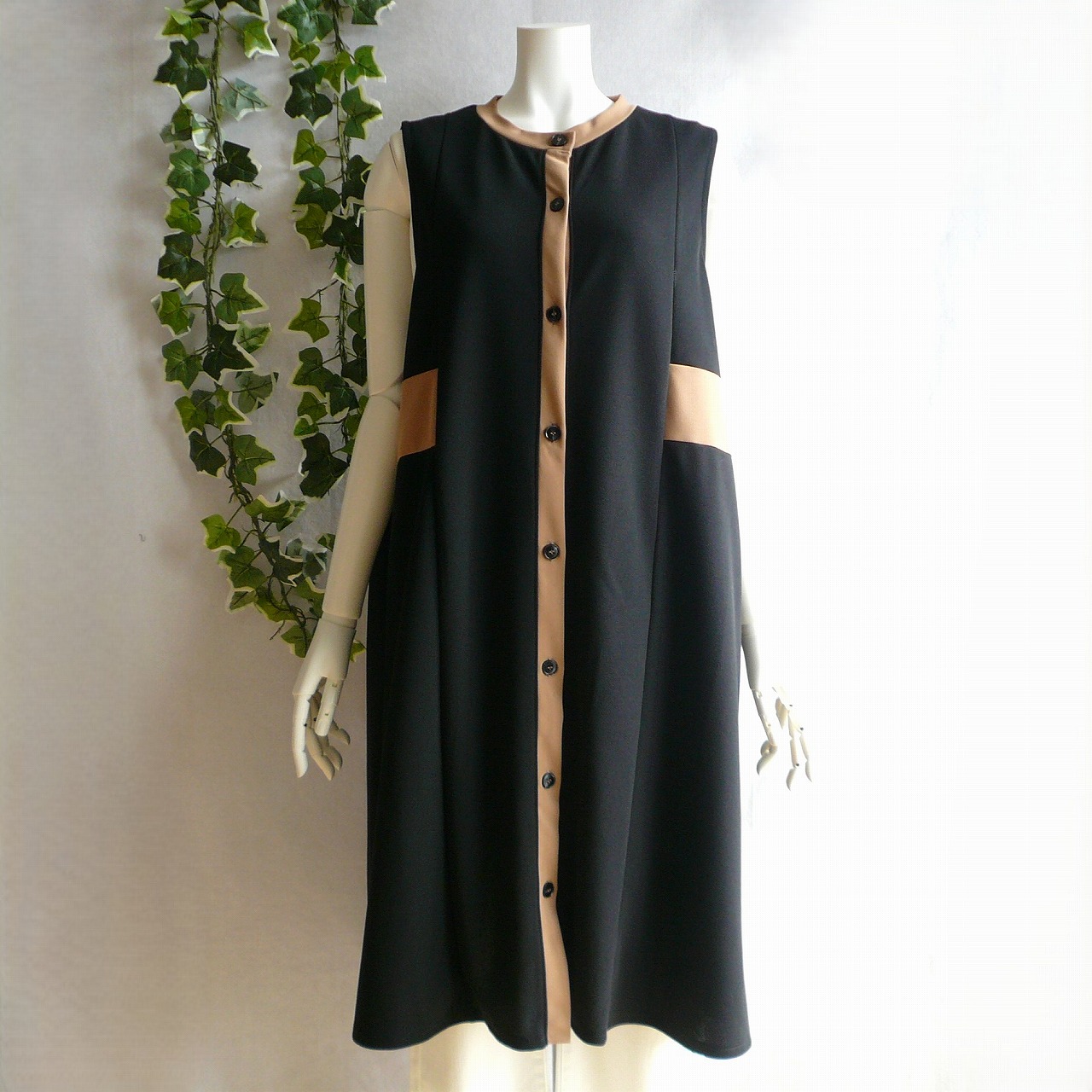新品 9963 ML 高級 バイカラー ワンピース 黒系 秋 レディース 配色切替 ノースリーブ モード ロング ジレ 大人 上質