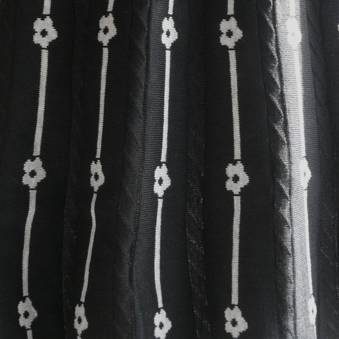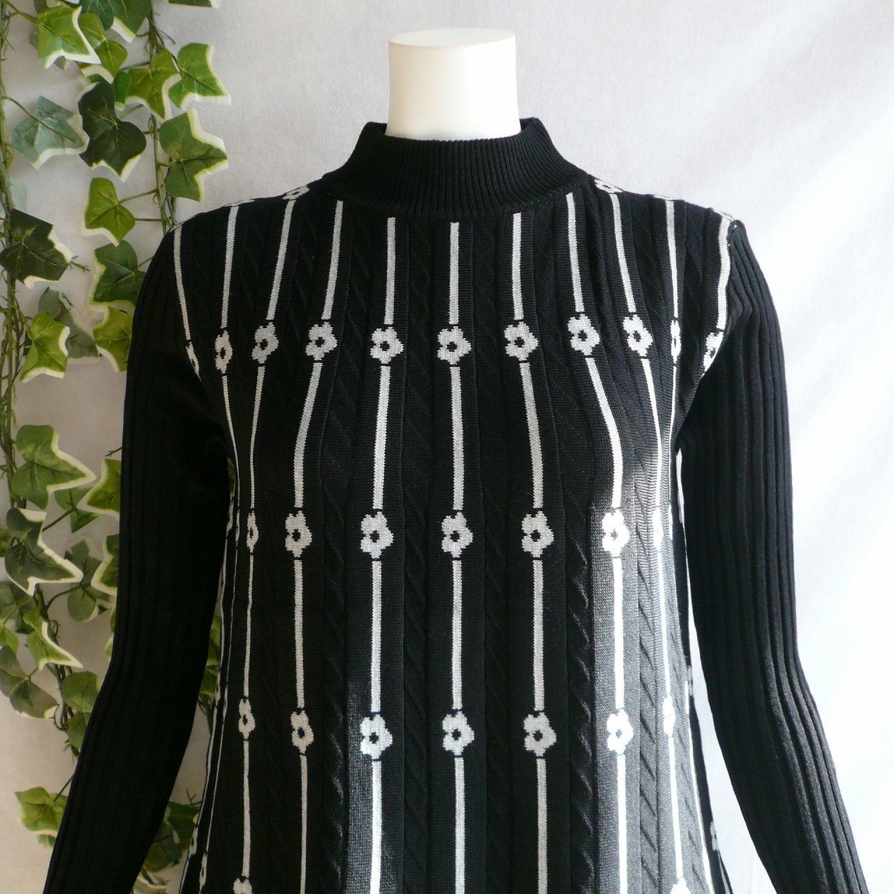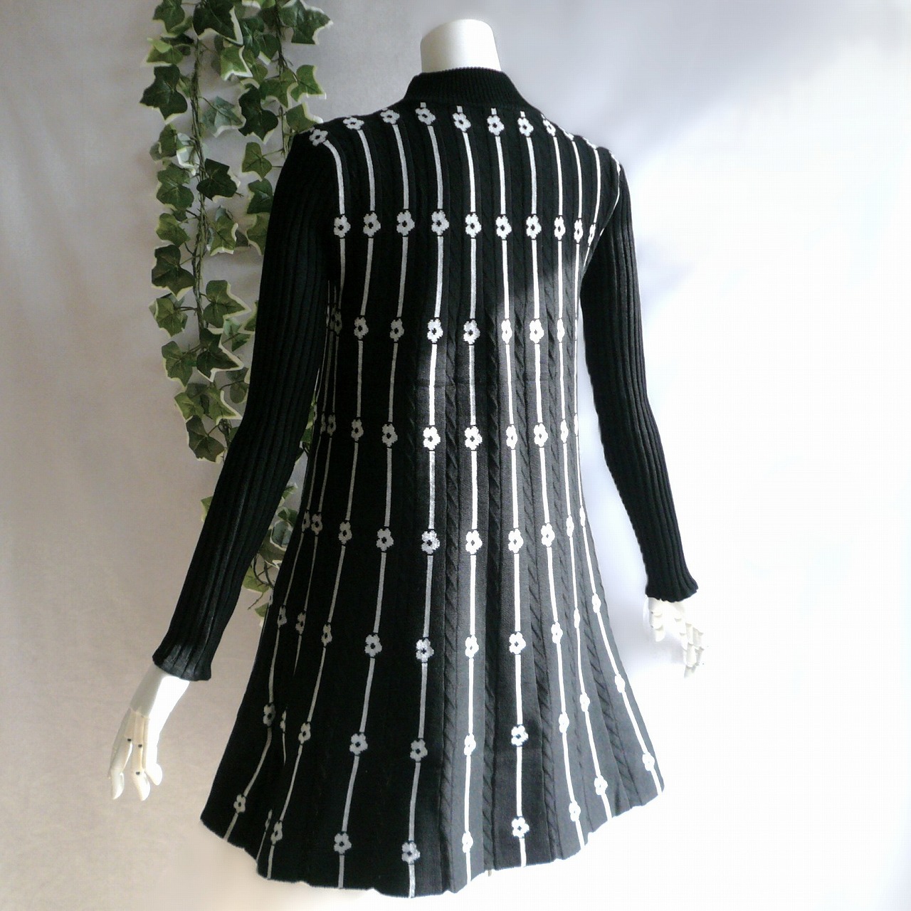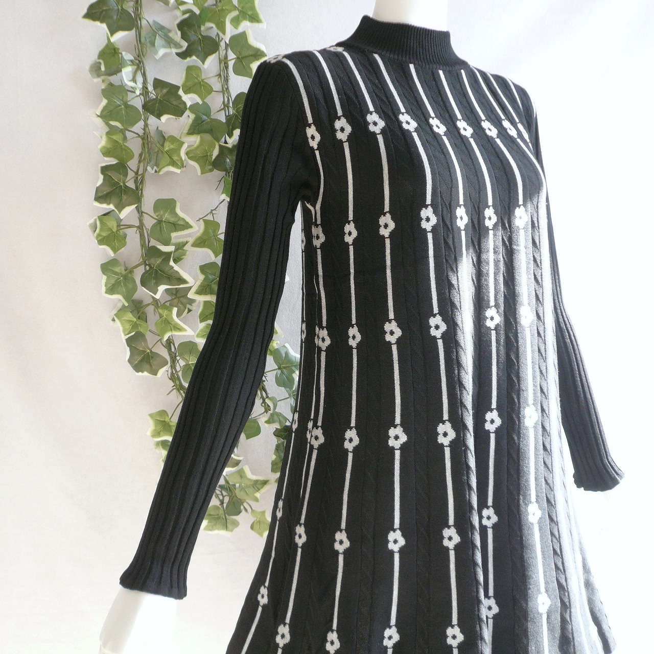 新品 9981 ML プリーツ織 ニット チュニック ワンピース 黒 グレー 秋 冬 レディース ライン 花柄 ハイネック リブ袖